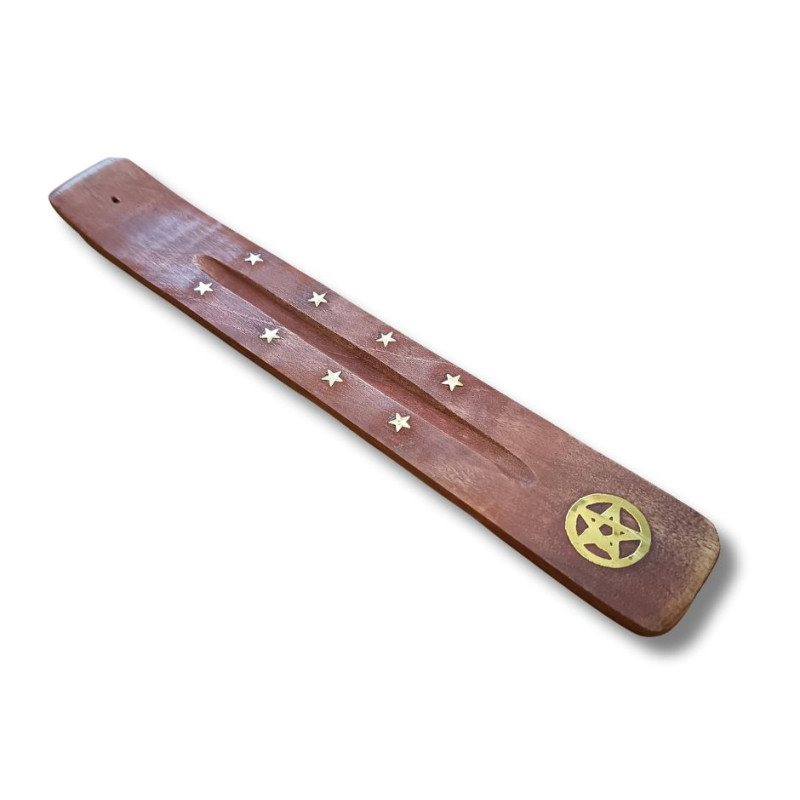 Elegancka, długa podstawka do kadzideł z motywem pentagramu to praktyczny i energetyczny dodatek do waszych rytuałów, medytacji oraz codziennego relaksu. Wykonana z naturalnego drewna mango, cechuje się lekkością, wytrzymałością i szlachetną fakturą. Smukły kształt sprawia, że idealnie zbiera popiół z tradycyjnych patyczków kadzidlanych, pomagając utrzymać porządek i bezpieczeństwo w przestrzeni.