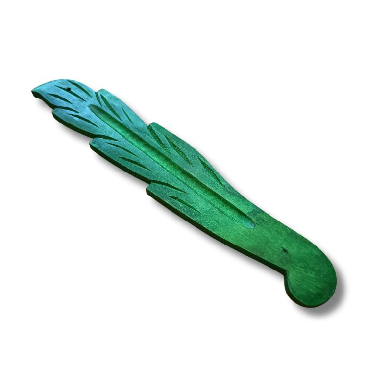 Podłużna podstawka pod kadzidła w kształcie liścia, w kojącym zielonym kolorze, to efektowny i praktyczny dodatek do waszej przestrzeni relaksu, medytacji czy domowego ołtarza. Wykonana z naturalnego drewna mango, łączy lekkość z wytrzymałością, dzięki czemu świetnie sprawdza się w codziennym użytkowaniu. Smukły kształt liścia o długości ok. 26 cm doskonale zbiera opadający popiół z patyczków kadzidlanych, pomagając utrzymać porządek na stoliku, komodzie czy parapecie.