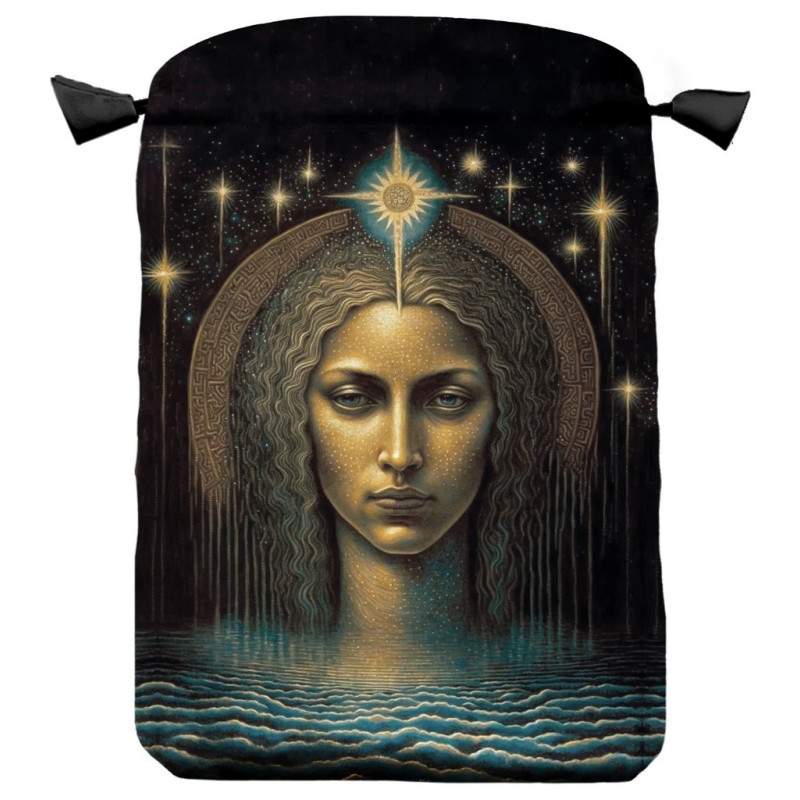Woreczek na karty, runy, talizmany - wzór TRIPLE GODDESS Silne energetycznie opakowanie na karty Tarota i runy dowolnej wielkości - woreczek wykonany z welwetu. Ściągany u góry troczkiem, dzięki czemu nie wypadną nawet niewielkie runy. Woreczek ozdobiony jest wyszytym talizmanem ochronnym w postaci symbolu TRIPLE GODDESS. Pełni podwójną rolę ochronną - zarówno w sensie czysto fizycznym chroni karty i runy przed zniszczeniem, jak też zapewnia ochronę energetyczną osobie pracującej z nimi....