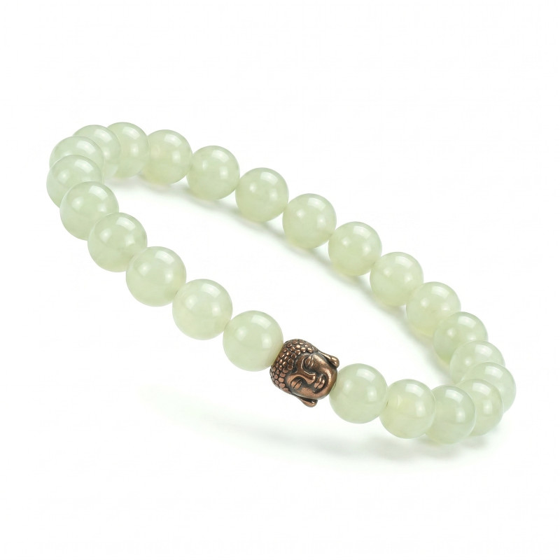 Bransoletka z symbolem kwiatu lotosu / mala nadgarstkowa (kryształ górski) Bransoletka z kryształu górskiego oraz z metalowym grawerunkiem o kształcie kwiatu lotosu. Ornament z grawerunkiem oraz pozostałe metalowe elementy zostały wykonane ze stopu cynku. Koraliki nawleczone są na bardzo mocną, elastyczną żyłkę jubilerską i łatwo dopasowują się do nadgarstka. Produkt nie zawiera niklu, ołowiu i kadmu. Parametry: średnica koralików: 8 mm ilość koralików: 21...