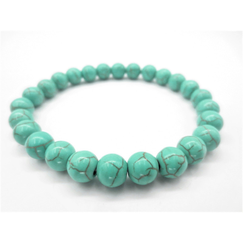 Bransoletka z howlitu barwionego na niebiesko Bransoletka wykonana jest z koralików z naturalnych kamieni, które nawleczone są na bardzo mocną, elastyczną żyłkę jubilerską, przez co łatwo dopasowuje się do nadgarstka. Parametry: średnica koralików: 8 mm ilość koralików: 22 sztuki obwód bransoletki: ok. 18 cm waga: ok. 20 g HOWLITHowlit to kamień mądrości, otwiera umysł na informacje i wiedzę, nie tylko książkową ale również...