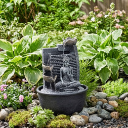 Fontanna prezentuje postać Buddy siedzącego obok mis o kaskadowej wodzie, nawiązujących do kształtów lotosów — symboli czystości, odnowy i duchowego wzrostu. Neutralna kolorystyka imitująca kamień naturalny oraz teksturowana powierzchnia sprawiają, że produkt łatwo komponuje się z różnymi stylami wnętrz — od nowoczesnych po przestrzenie zen lub strefy relaksu.