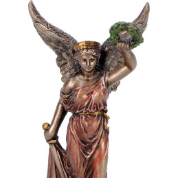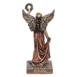 Wprowadź do swojego wnętrza symbol triumfu, siły i zwycięstwa dzięki eleganckiej figurce przedstawiającej Nike - grecką boginię zwycięstwa. Model ukazuje ją w dumnej, triumfalnej pozie, z uniesionym nad głową wieńcem laurowym - ponadczasowym symbolem chwały i sukcesu. Misternie wykonane skrzydła dodają kompozycji lekkości i dynamiki, podkreślając boski charakter postaci.