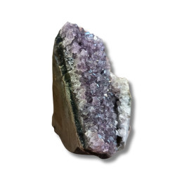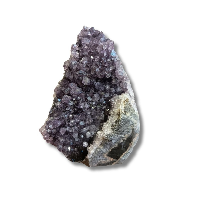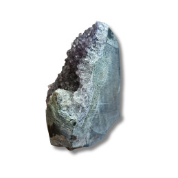 Ametyst - geoda ametystowa Oferowany okaz to geoda ametystowa - naturalny kryształ, który rósł w głębi ziemi przez miliony lat. Pustki, w których narastały kryształy minerałów (tak jak w okazie widocznym na zdjęciu), pojawiają się głównie w skałach magmowych. Takie naturalne próżnie są pamiątkami po znajdujących się w nich niegdyś gazach pochodzących z magmy i lawy, czyli stopów skalnych o temperaturach liczonych w setkach stopni Celsjusza. Uwagi: Ewentualna...