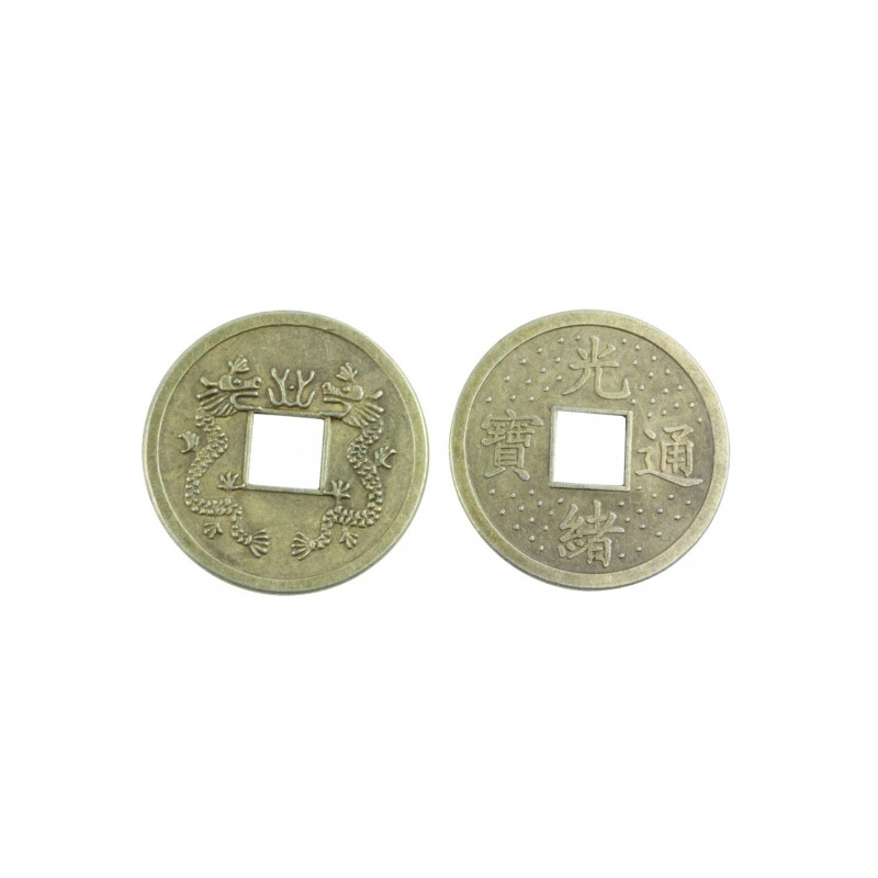 Replika tradycyjnej chińskiej monety z kwadratowym otworem w środku - symbolu harmonii pomiędzy Niebem (okrągły kształt) i Ziemią (kwadratowy środek). Na awersie monety widoczna jest inskrypcja w języku chińskim, a na rewersie motyw dwóch smoków otaczających perłę - potężny symbol cesarskiej mocy, bogactwa i ochrony.