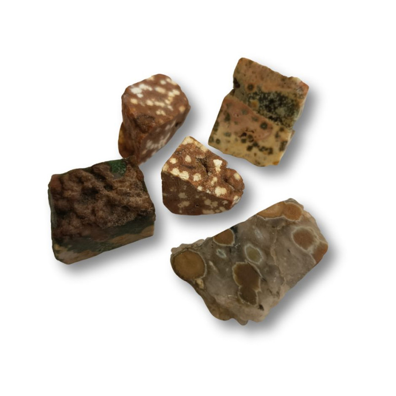 Każdy egzemplarz jest wyjątkowy – posiada unikalne wzory i odcienie, od subtelnych błękitów po głębokie barwy ziemi. Zdjęcie przedstawia przykładowy kamień.
