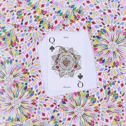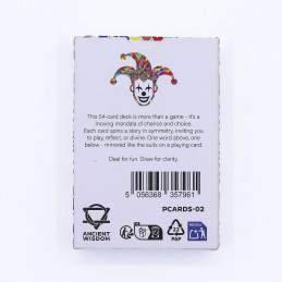 Talia zawiera 54 karty (52 standardowe oraz 2 jokery), wydrukowane na wysokiej klasy papierze kartonowym, zapewniającym gładkie tasowanie i trwałość podczas użytkowania. Grafiki charakteryzują się wielowarstwową, symetryczną ornamentyką mandali, która tworzy intensywne, wizualnie angażujące doświadczenie, idealne do wykorzystania zarówno w grach, jak i w pracy nad koncentracją czy świadomością własną.