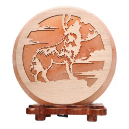 Dekoracyjna lampa solna w kształcie koła z sylwetką wilka na sierpie księżyca to połączenie naturalnej soli i ciepłego, nastrojowego światła. Rzeźbiona bryła soli osadzona jest na eleganckiej podstawie z drewna paulowni, dzięki czemu lampa pięknie prezentuje się w salonie, sypialni, gabinecie terapeutycznym czy pokoju nastolatka.