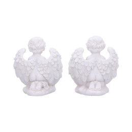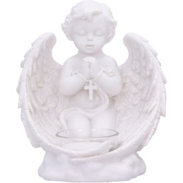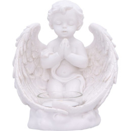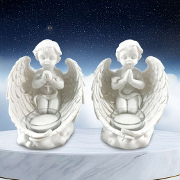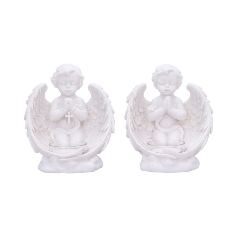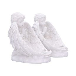 Każdy ze świeczników przedstawia spokojnego cheruba w modlitewnej pozie - z skrzydłami rozłożonymi delikatnie w dół, z zamkniętymi oczami, wyrażającymi pogodę ducha i ciszę. Ten motyw przynosi skojarzenia z opieką, spokojem, świętością i aurą duchowego ukojenia - idealny dla osób ceniących subtelność, światło i pozytywną energię.
