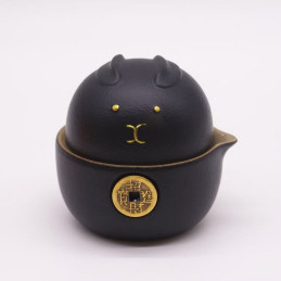 zestaw herbaciany wykonany z ceramiki, zaprojektowany w formie travel pack. Czajniczek i dwa kubki można złożyć razem, tworząc zwartą całość przypominającą siedzącego kota. Zdobienia z motywem kota i złotej monety nadają zestawowi elegancki, symboliczny wygląd i podkreślają jego dekoracyjny charakter.