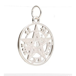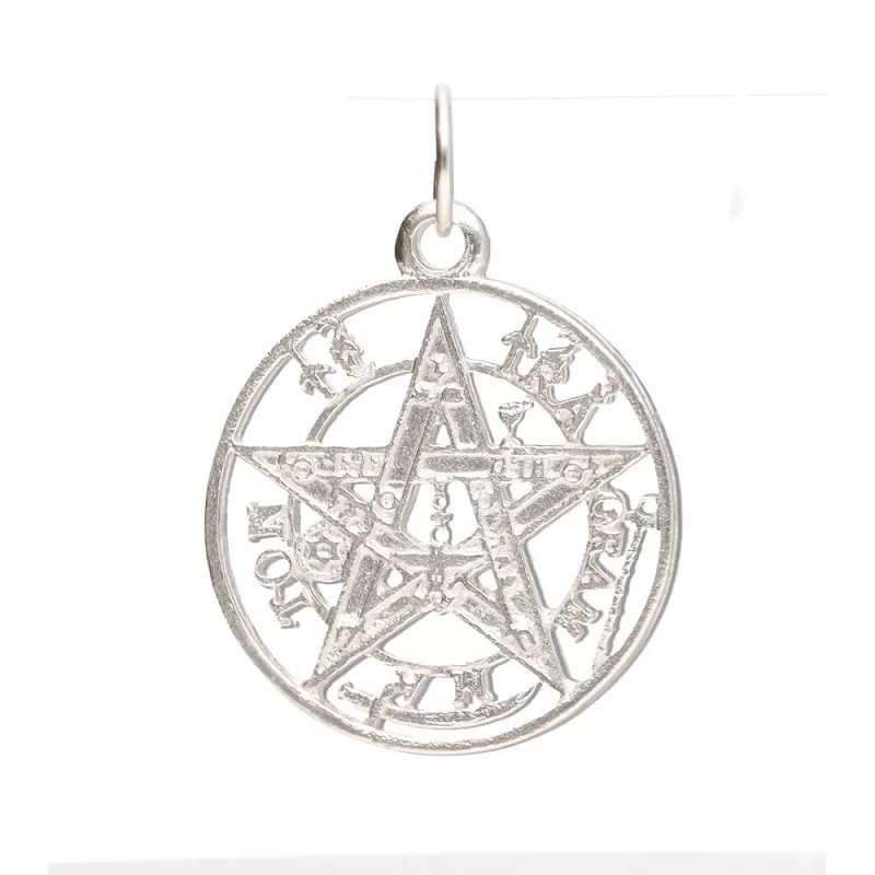 Pentagram Potęga Światła zwany też białym pentagramem, podstawowy czysty znak ochronny, tarcza która odbija złe życzenia i klątwy i zwraca je ku nadawcy. Chroni podczas praktyk magicznych nie pozwalając przekroczyć niebezpiecznych granic. Może być noszony jako talizman bądź amulet. Przy pomocy pentagramu można sprowadzić siły nieczyste na swoje miejsce, zamknąć je w pułapce, uwięzić, pozwala opanować siły nadprzyrodzone. Materiał: mosiądz Wymiary: 2,5cm x 2,5cm Rzemyk w komplecie